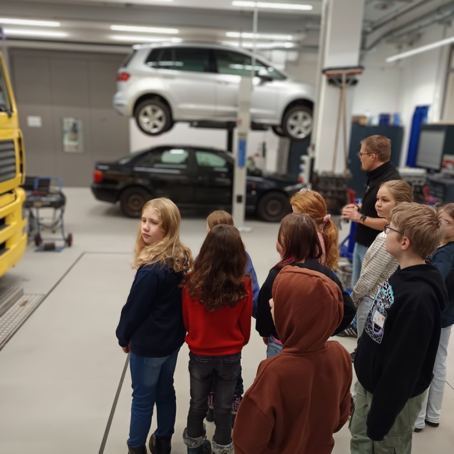 Nach der Begrüßung und der Verteilung von Namensschildern startete der Vormittag mit einer spannenden Führung durch die Schule. Dabei gab es Einblicke in verschiedene Werkstätten. So wurden zunächst die KFZ- und LKW-Werkstatt besucht. Dabei war ein Highlight das Probesitzen im LKW.