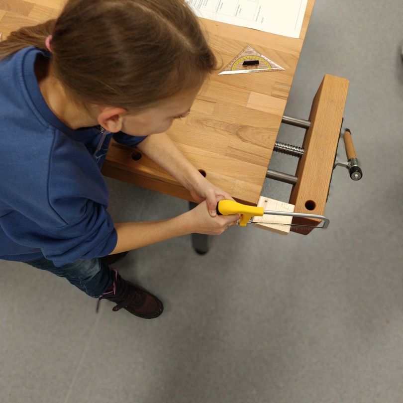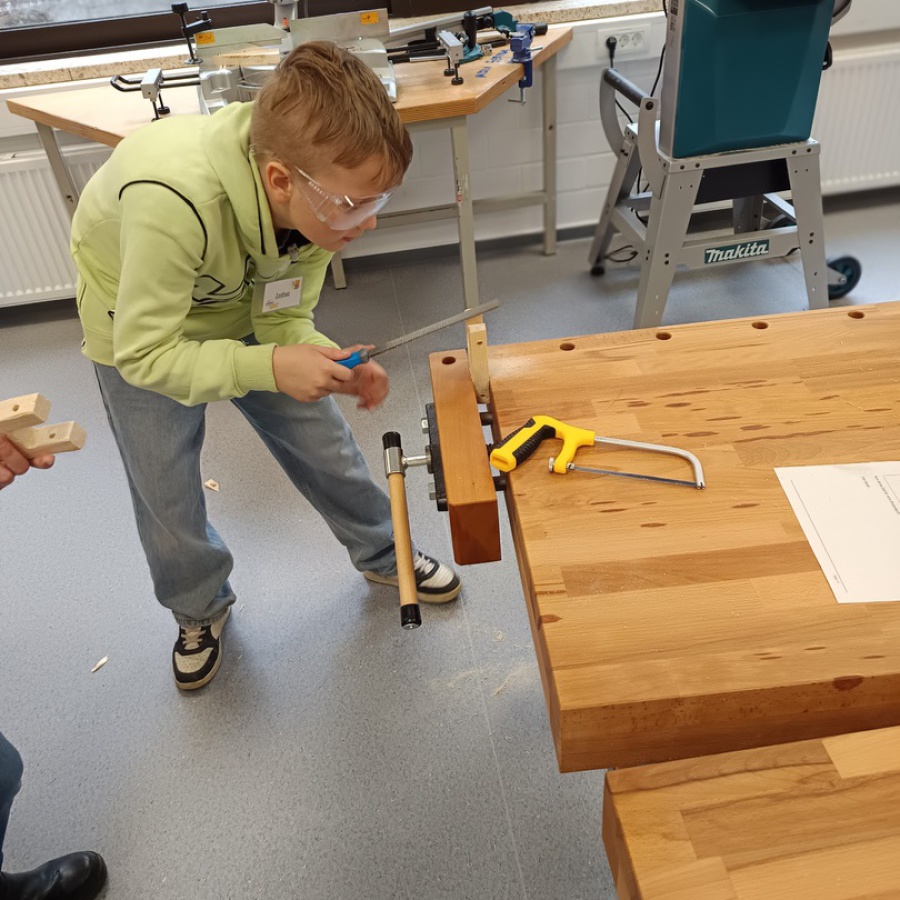 Im Anschluss starteten im mit Kinderwerkbänken ausgestatteten neuen Werkraum das Werken mit Holz: Die Kinder konnten sich zwischen einem Engel oder einem Rückziehauto entscheiden und dann wurde unter fachkundiger Anleitung fleißig gesägt, gefeilt, bemalt, geklebt und gestaunt.
